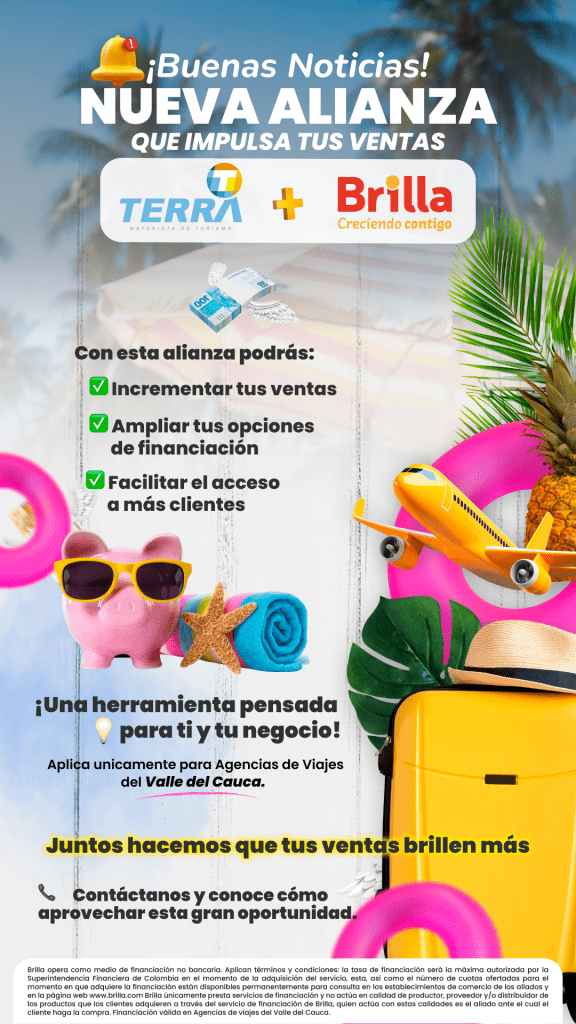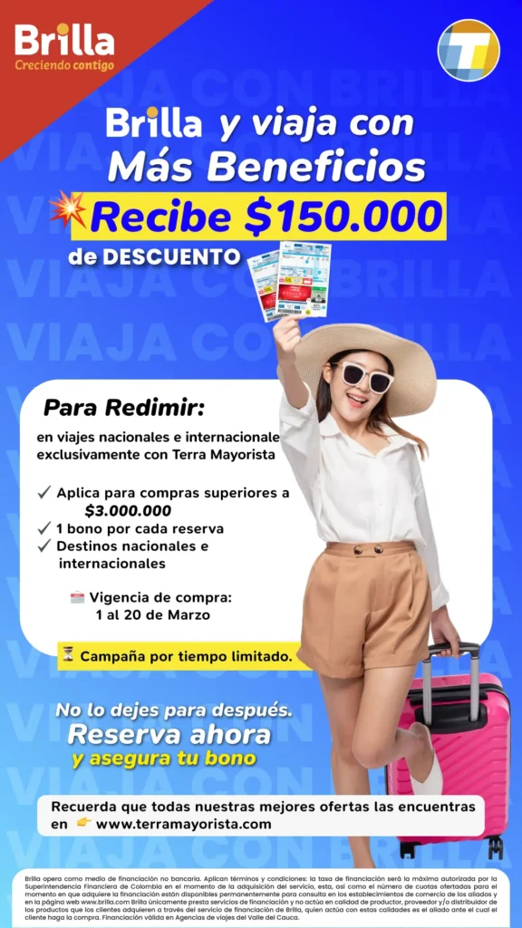 Brilla opera como medio de financiación no bancaria. Aplican términos y condiciones: la tasa de financiación será la máxima autorizada por la Superintendencia Financiera de Colombia en el momento de la adquisición del servicio, esta, así como el número de cuotas ofertadas para el momento en que adquiere la financiación están disponibles permanentemente para consulta en los establecimientos de comercio de los aliados y en la página web www.brilla.com Brilla únicamente presta servicios de financiación y no actúa en calidad de productor, proveedor y/o distribuidor de los productos que los clientes adquieren a través del servicio de financiación de Brilla, quien actúa con estas calidades es el aliado ante el cual el cliente haga la compra. Financiación válida en Agencias de viajes del Valle del Cauca.