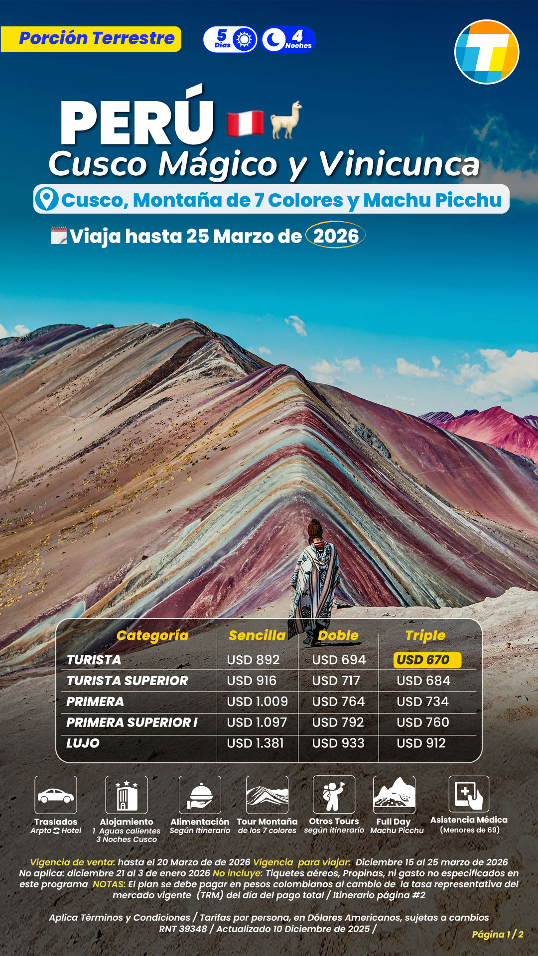 Tarifas por persona en Dólares Americanos, sujetas a cambios sin previo aviso, y a disponibilidad de cupos.
