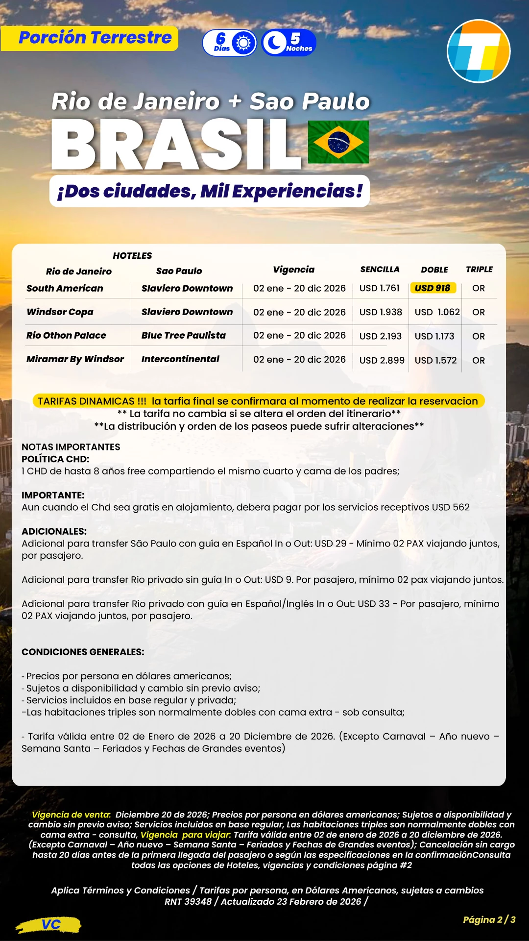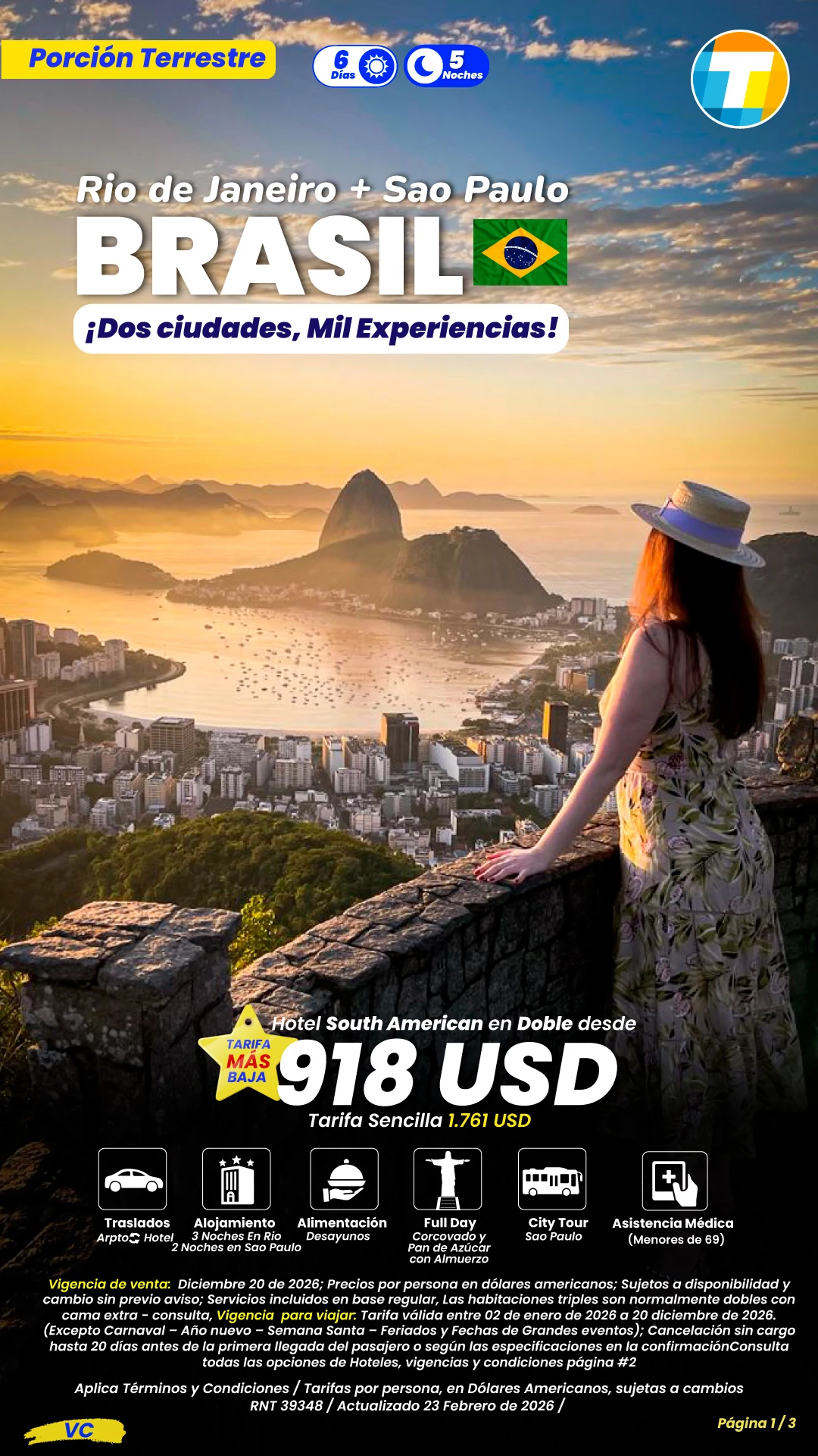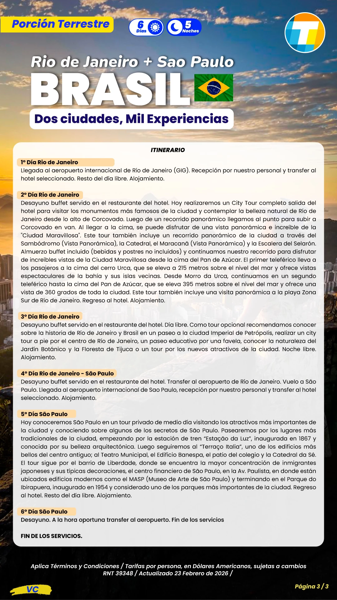 • 3 Noches de alojamiento en Rio, 2 Noches de alojamiento en Sao Paulo habitación Standard con desayuno e impuestos obligatorios incluidos