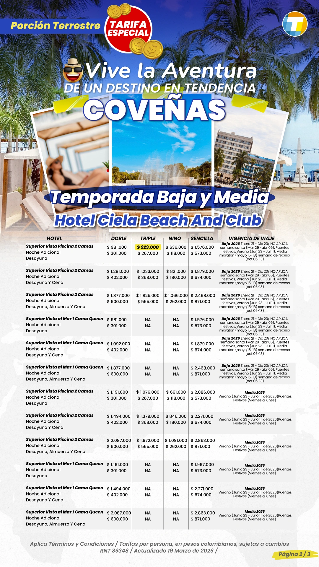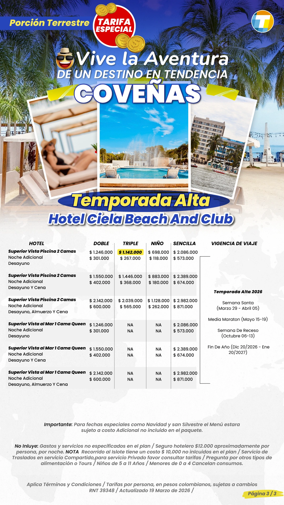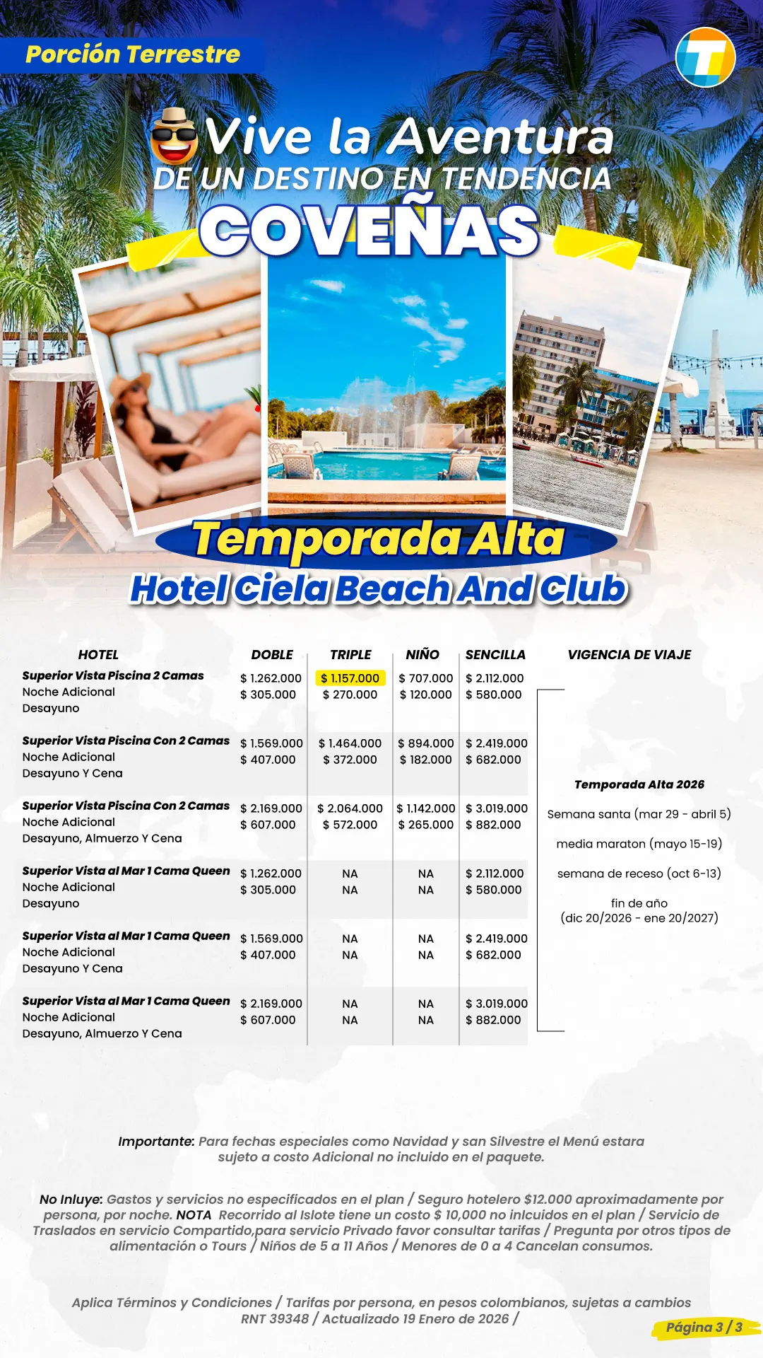 Tarifas por persona en Pesos Colombianos, sujetas a cambios sin previo aviso, sujetas a disponibilidad de cupos.