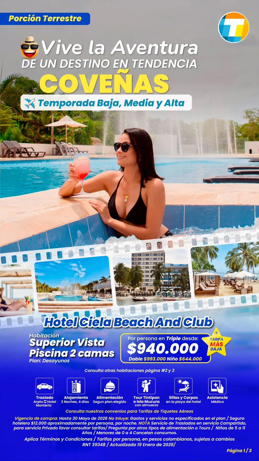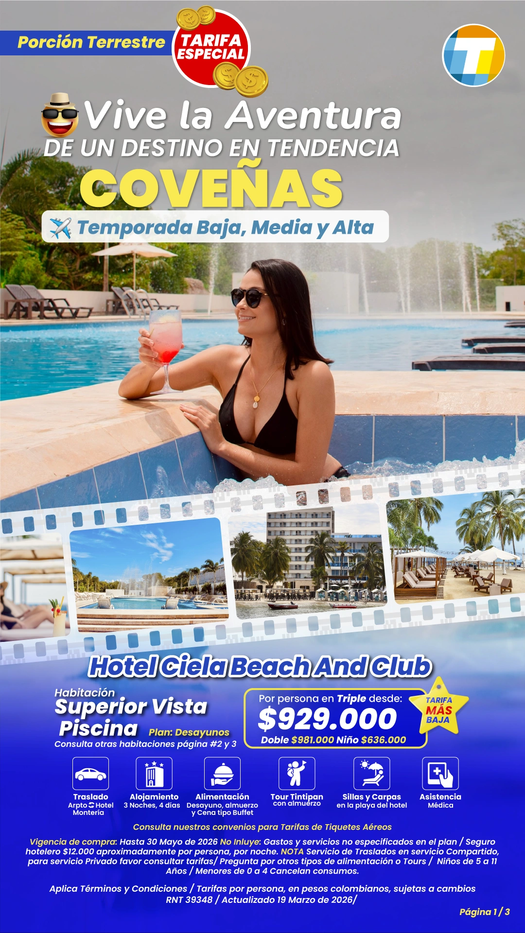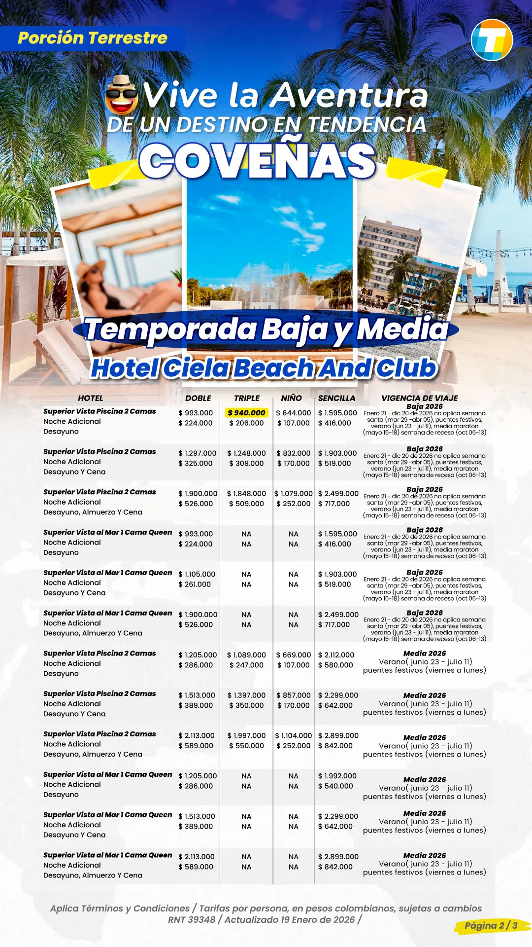 Tarifas por persona en Pesos Colombianos, sujetas a cambios sin previo aviso, sujetas a disponibilidad de cupos.