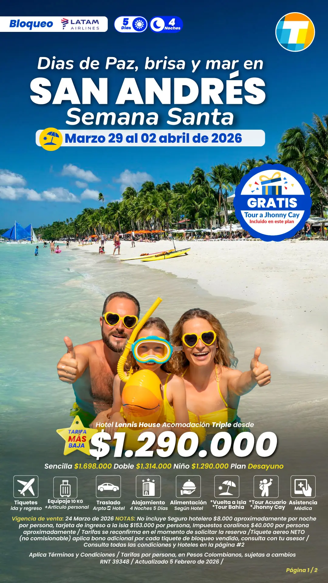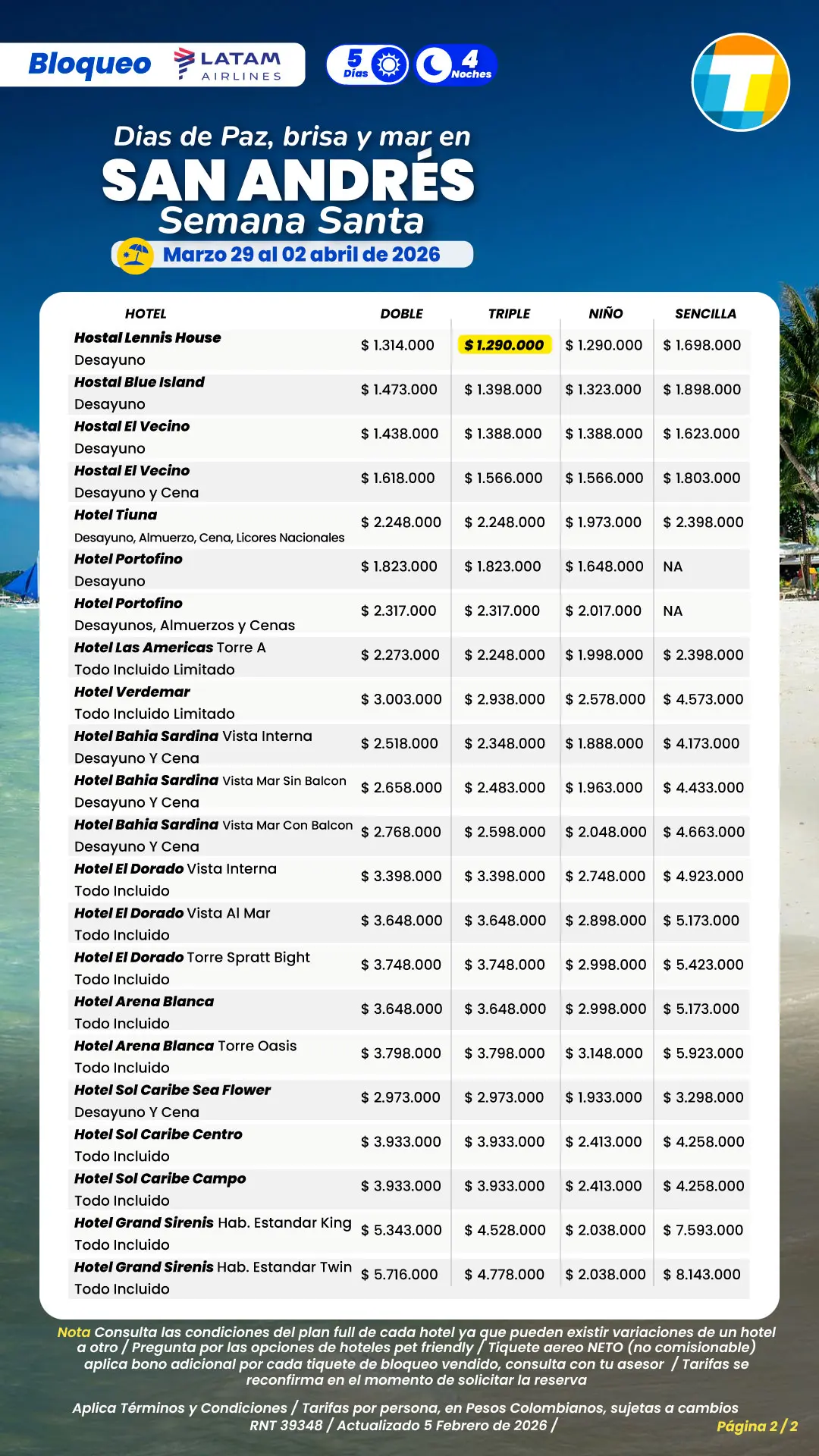 Tarifas por persona en pesos colombianos, sujetas a cambios sin previo aviso, sujetas a disponibilidad de cupos.
