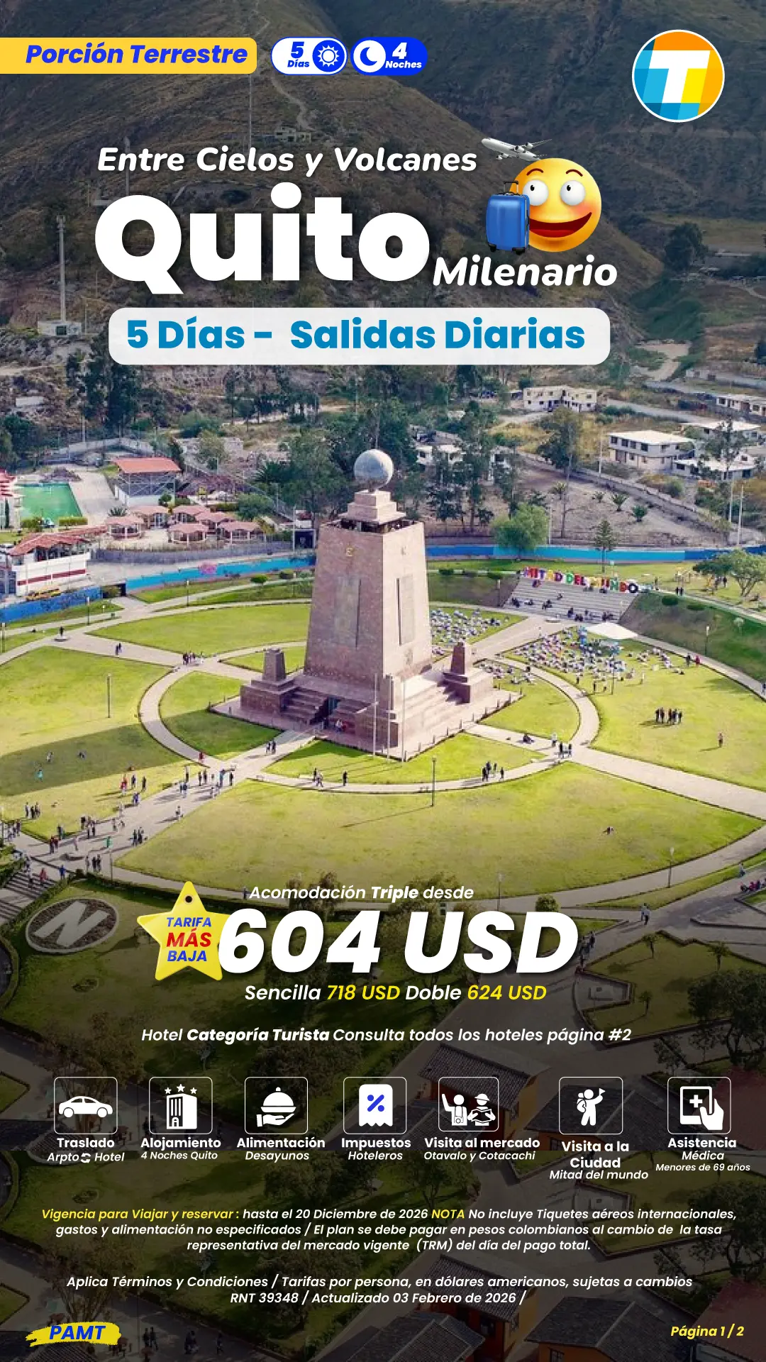 Con Atracciones (6h) 8:30 Salida hacia el Centro Histórico “Patrimonio de la Humanidad”, visitaremos la Basílica (incluye ingreso para conocer sus torres y vitrales gigantes), Plaza Grande, Palacio de Gobierno, La Compañía de Jesús (incluye ingreso y visita guiada) Plaza e Iglesia de San Francisco, Mirador de la Virgen Alada del Panecillo seguido traslado a la ciudad Mitad del Mundo tiempo para almorzar y visita del Monumento a la Línea Ecuador (incluido) y el Museo del “Intiñan” (incluido) finalmente parada en el Teleférico para quienes deseen visitarlo (por su cuenta) sino retorno a cada hotel. Alojamiento.