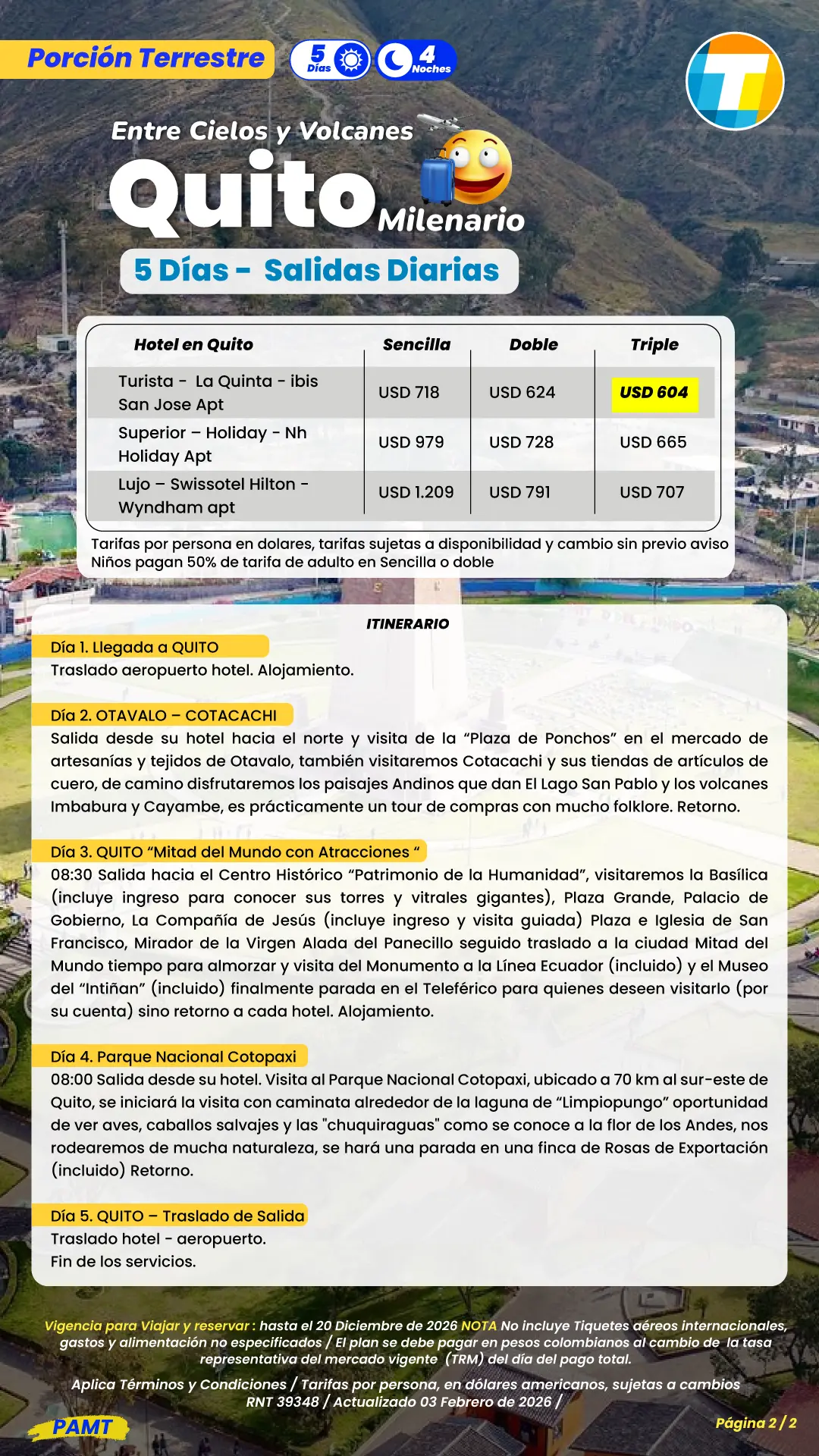 Tarifas por persona en Dólares Americanos, sujetas a cambios sin previo aviso, y a disponibilidad de cupos.