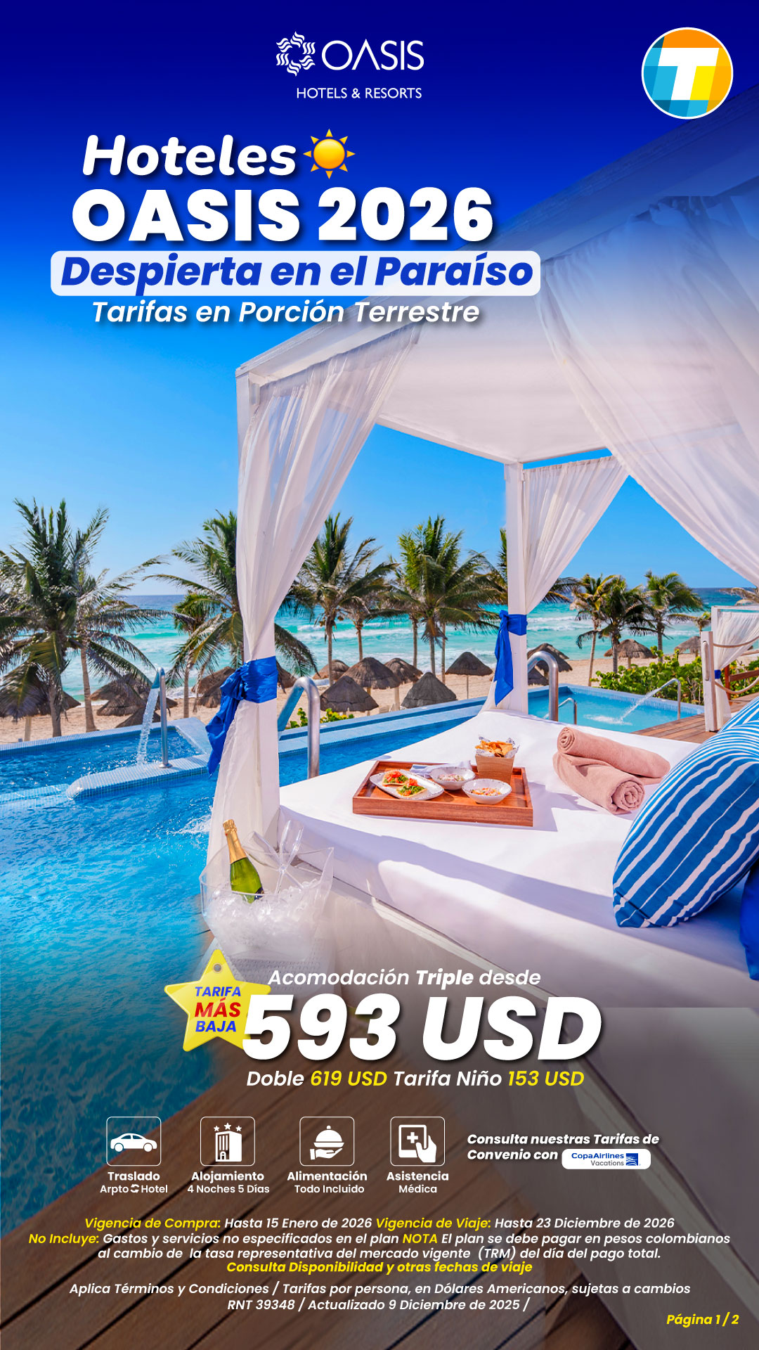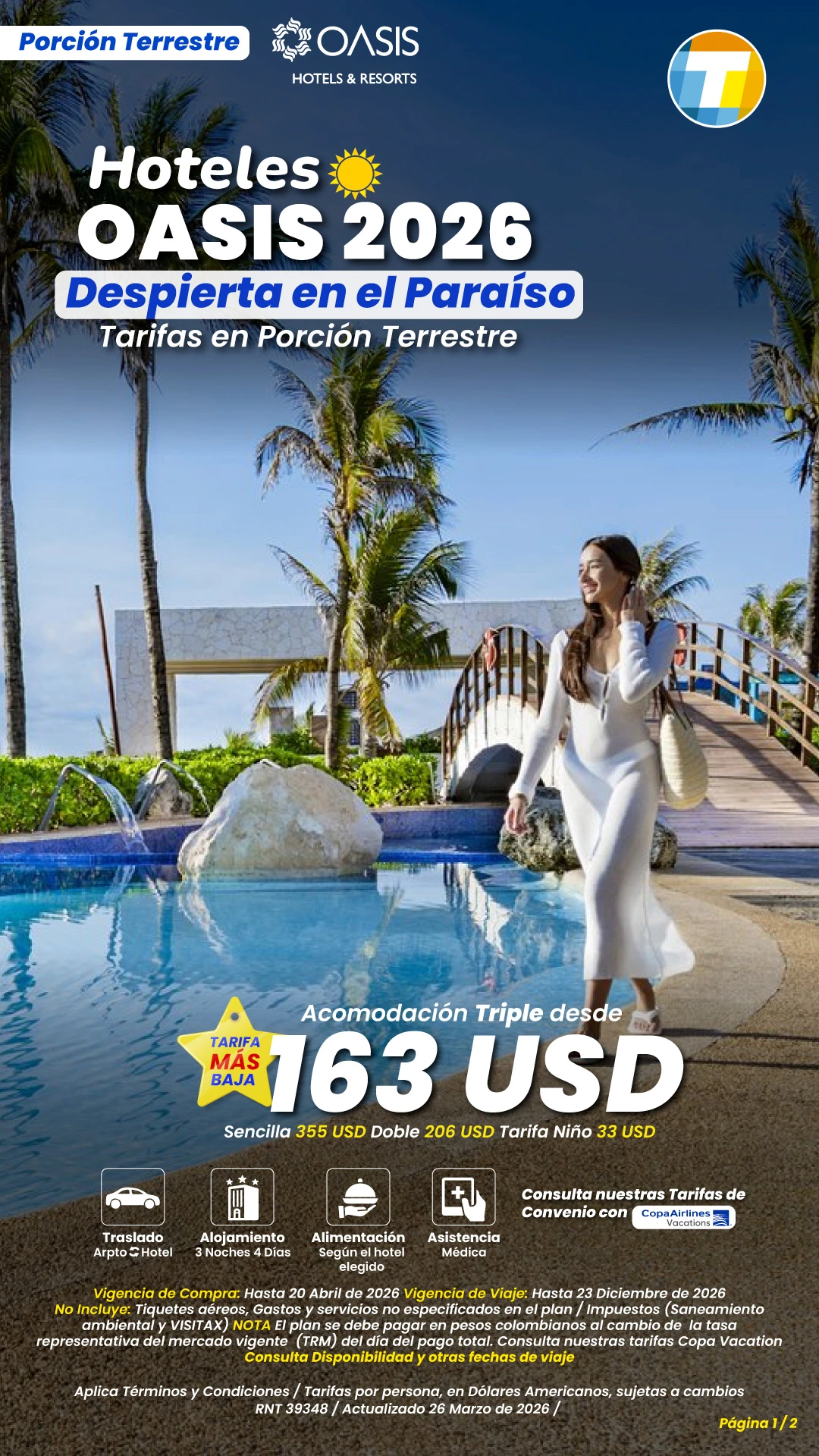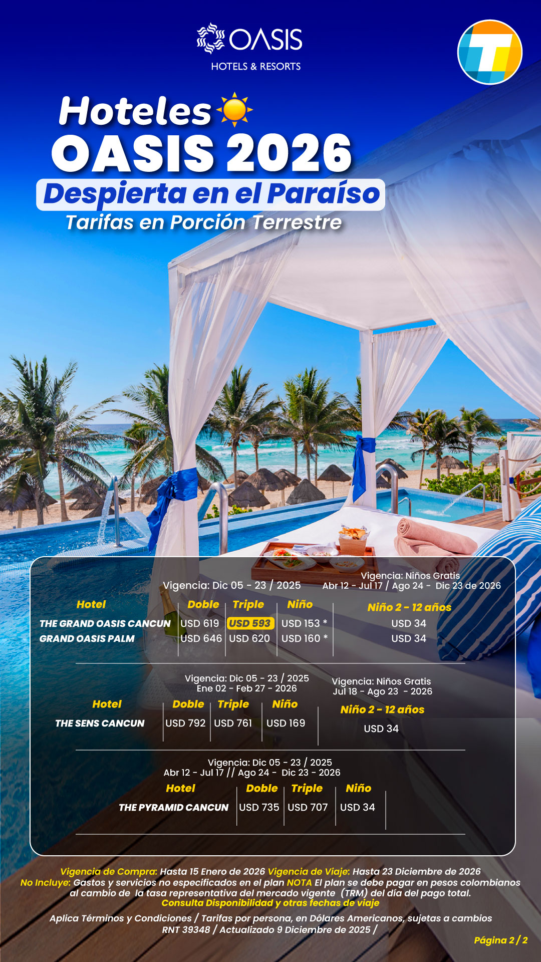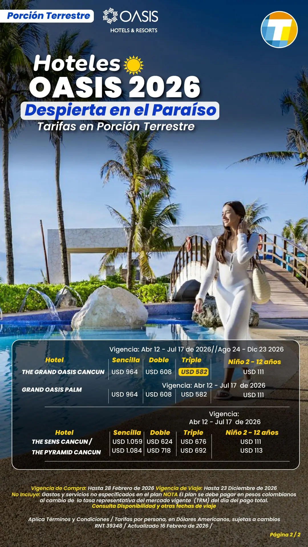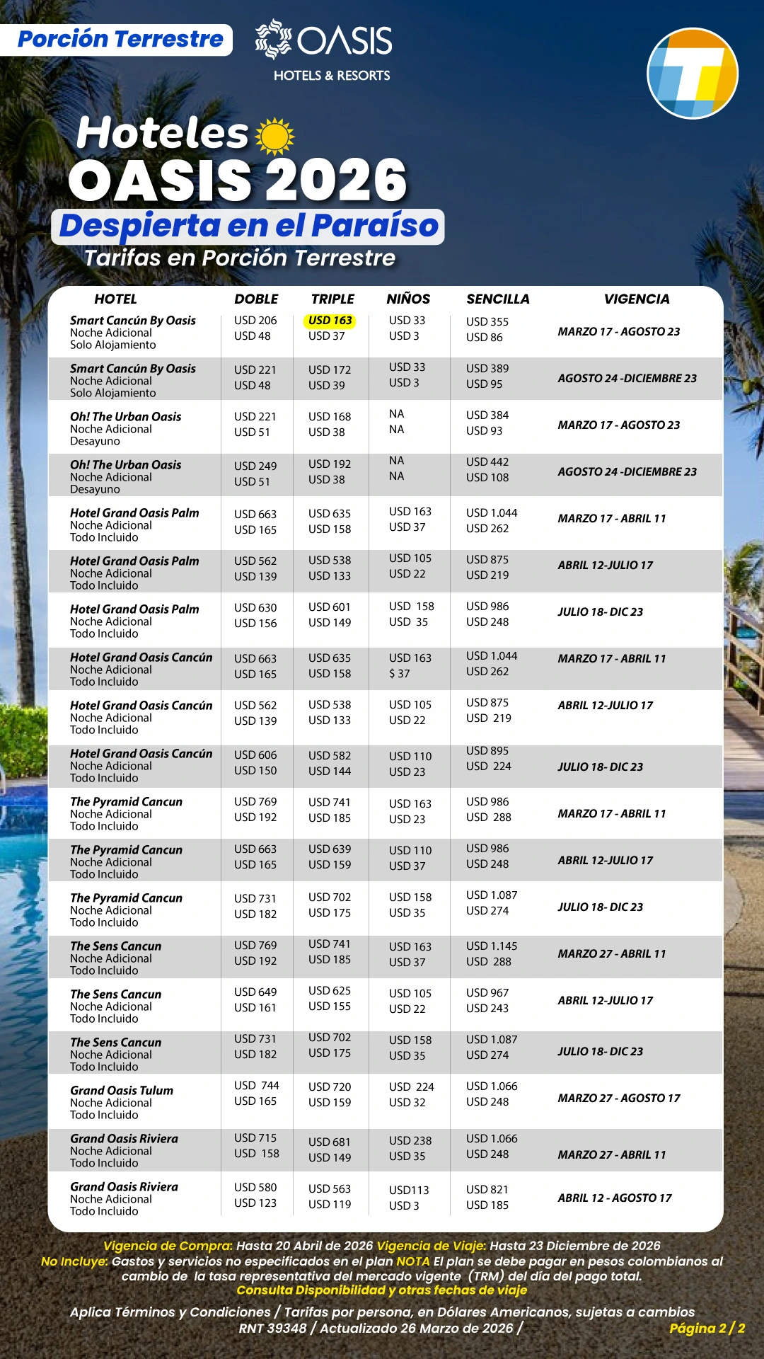 Tarifas por persona en Dólares Americanos, sujetas a cambios sin previo aviso, y a disponibilidad de cupos.