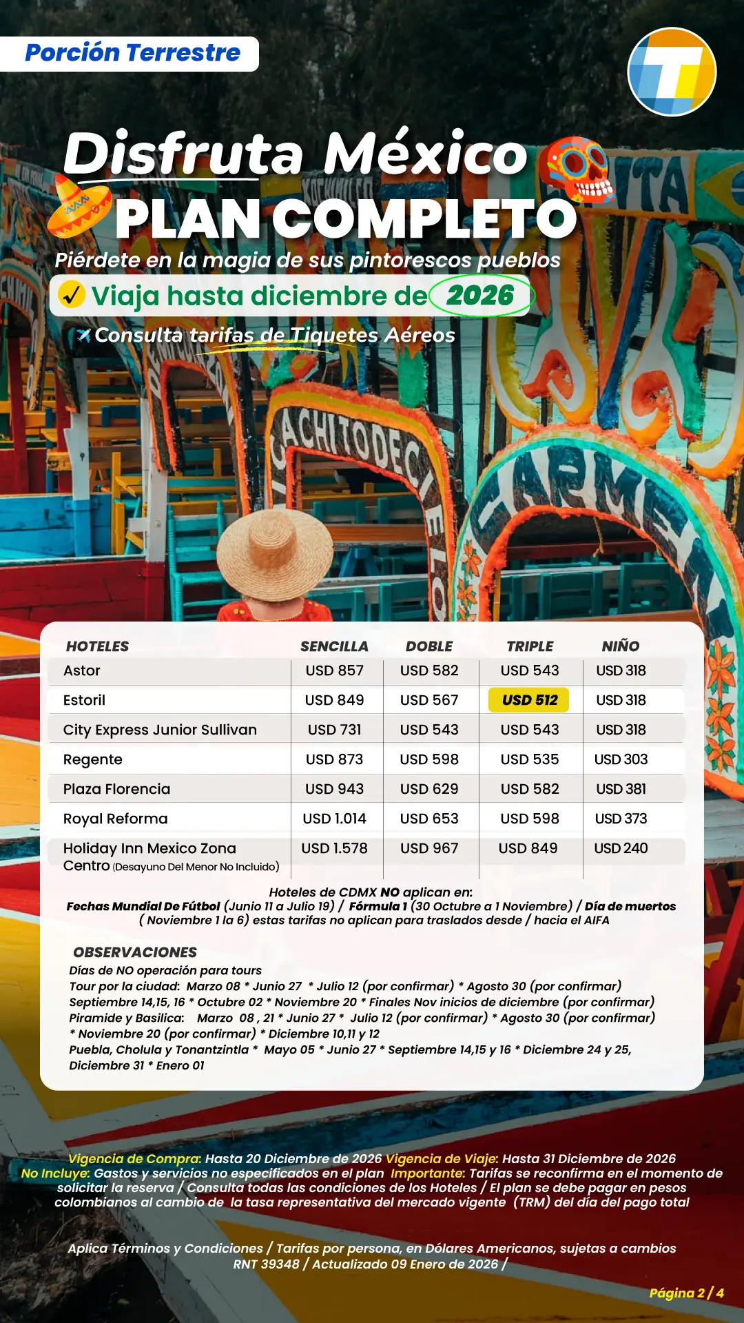Tarifas por persona en Dólares Americanos, sujetas a cambios sin previo aviso, sujetas a disponibilidad de cupos.