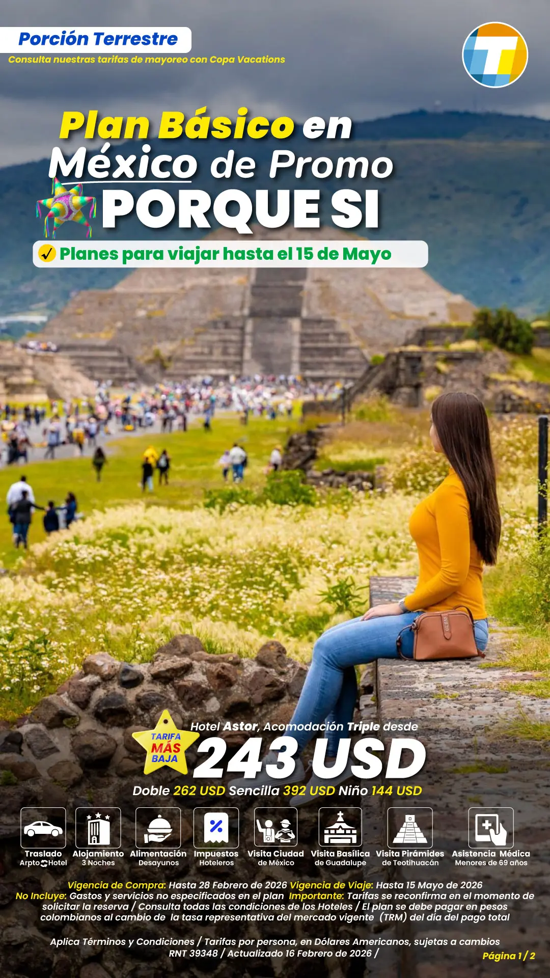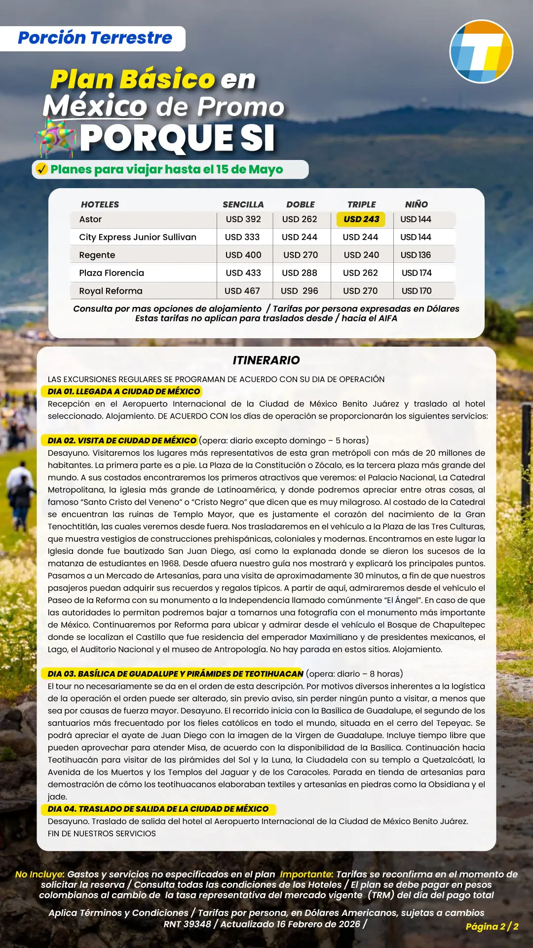 Tarifas por persona en Dólares Americanos, sujetas a cambios sin previo aviso, sujetas a disponibilidad de cupos.