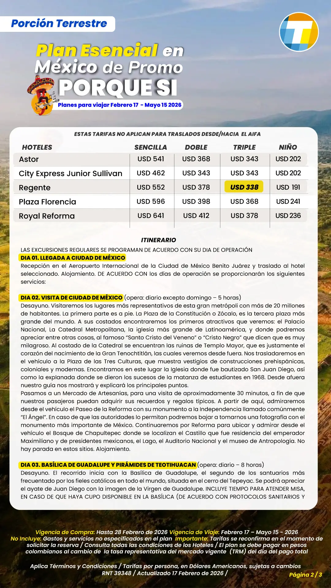 Tarifas por persona en Dólares Americanos, sujetas a cambios sin previo aviso, sujetas a disponibilidad de cupos.