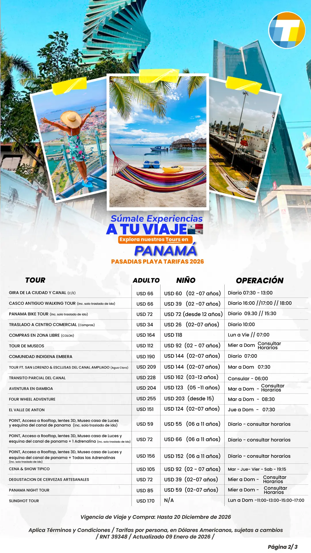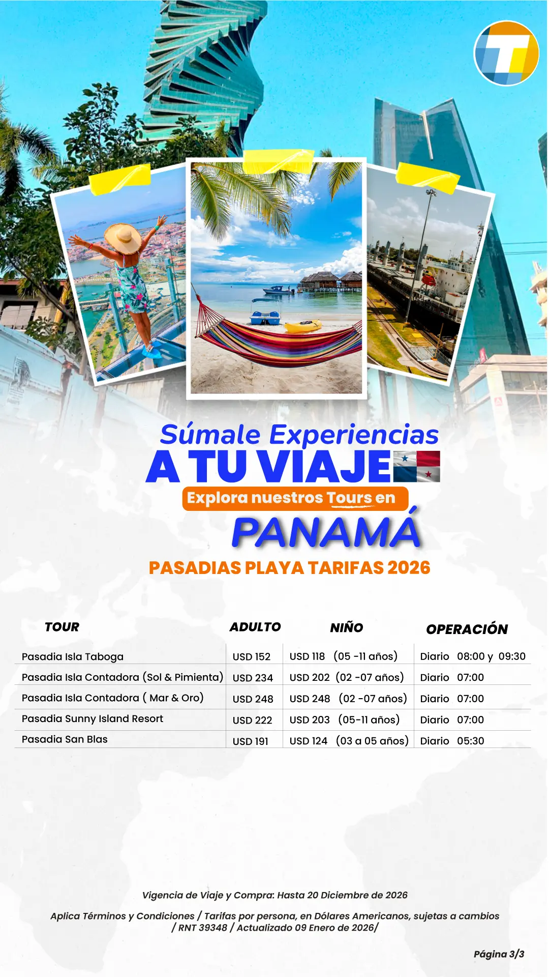 Tarifas por persona en Dólares Americanos, sujetas a cambios sin previo aviso, sujetas a disponibilidad de cupos.