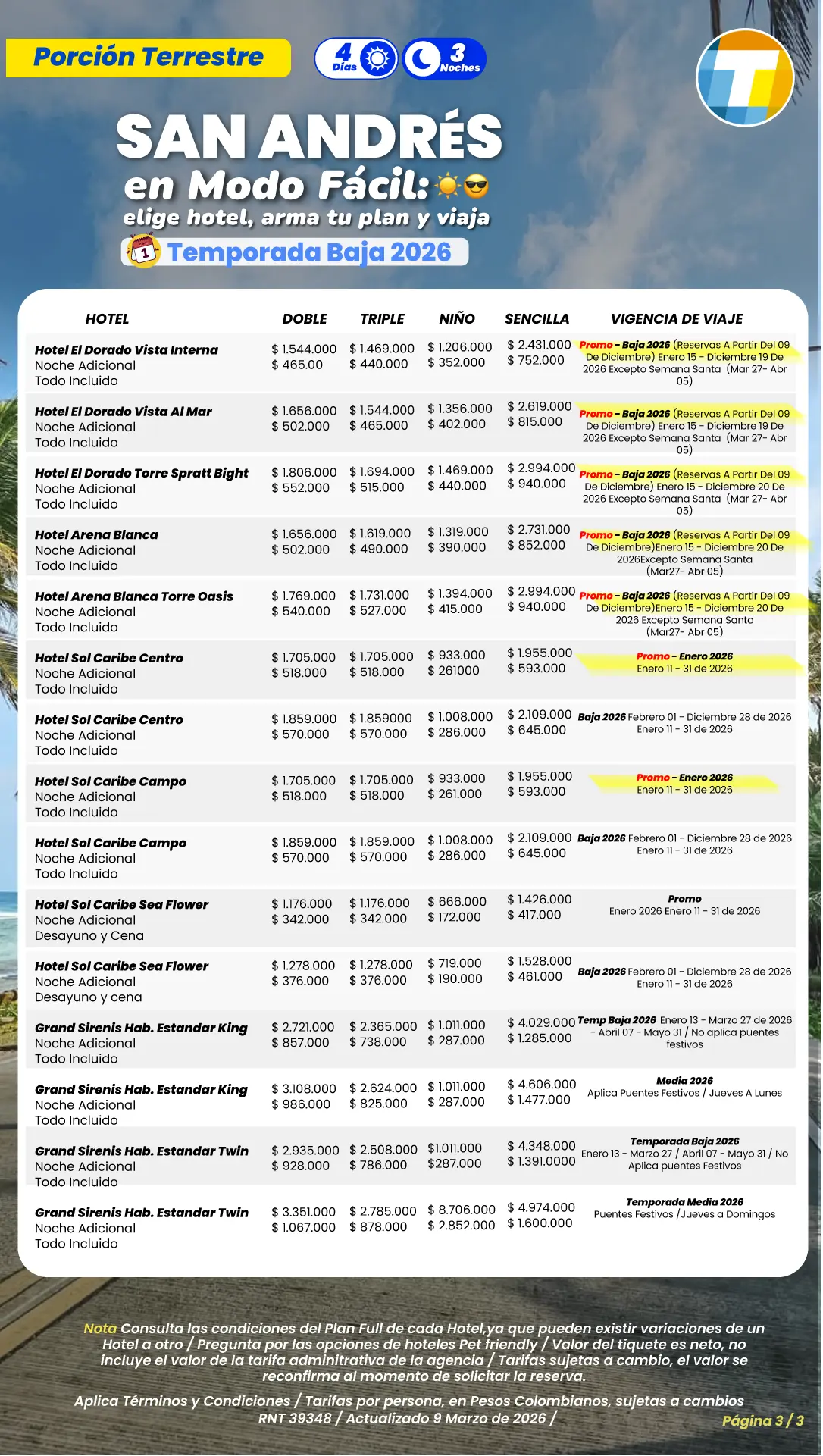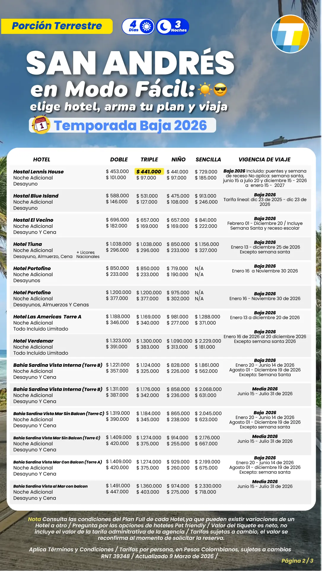 Tarifas por persona en Pesos Colombianos, sujetas a cambios sin previo aviso, sujetas a disponibilidad de cupos.