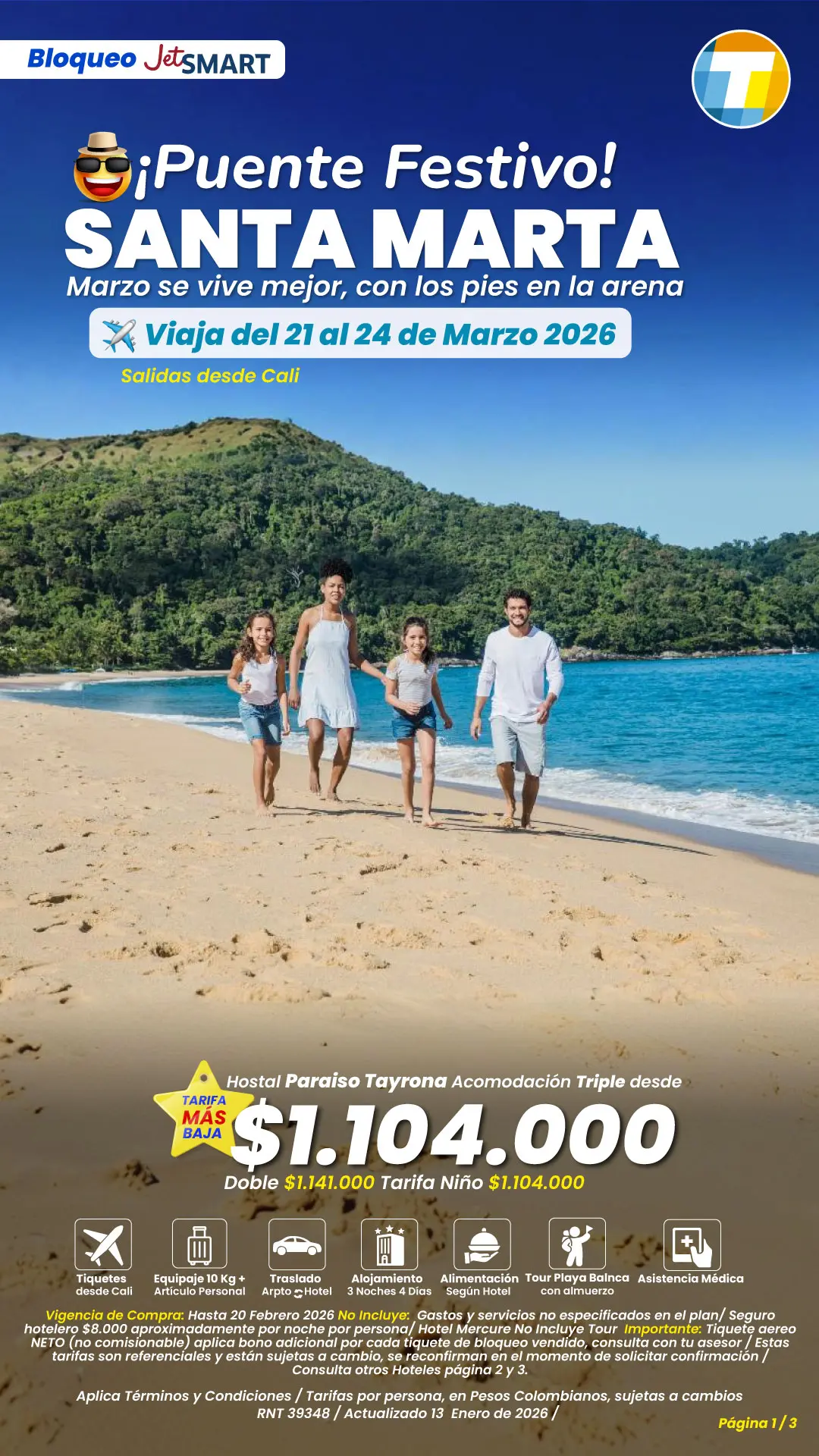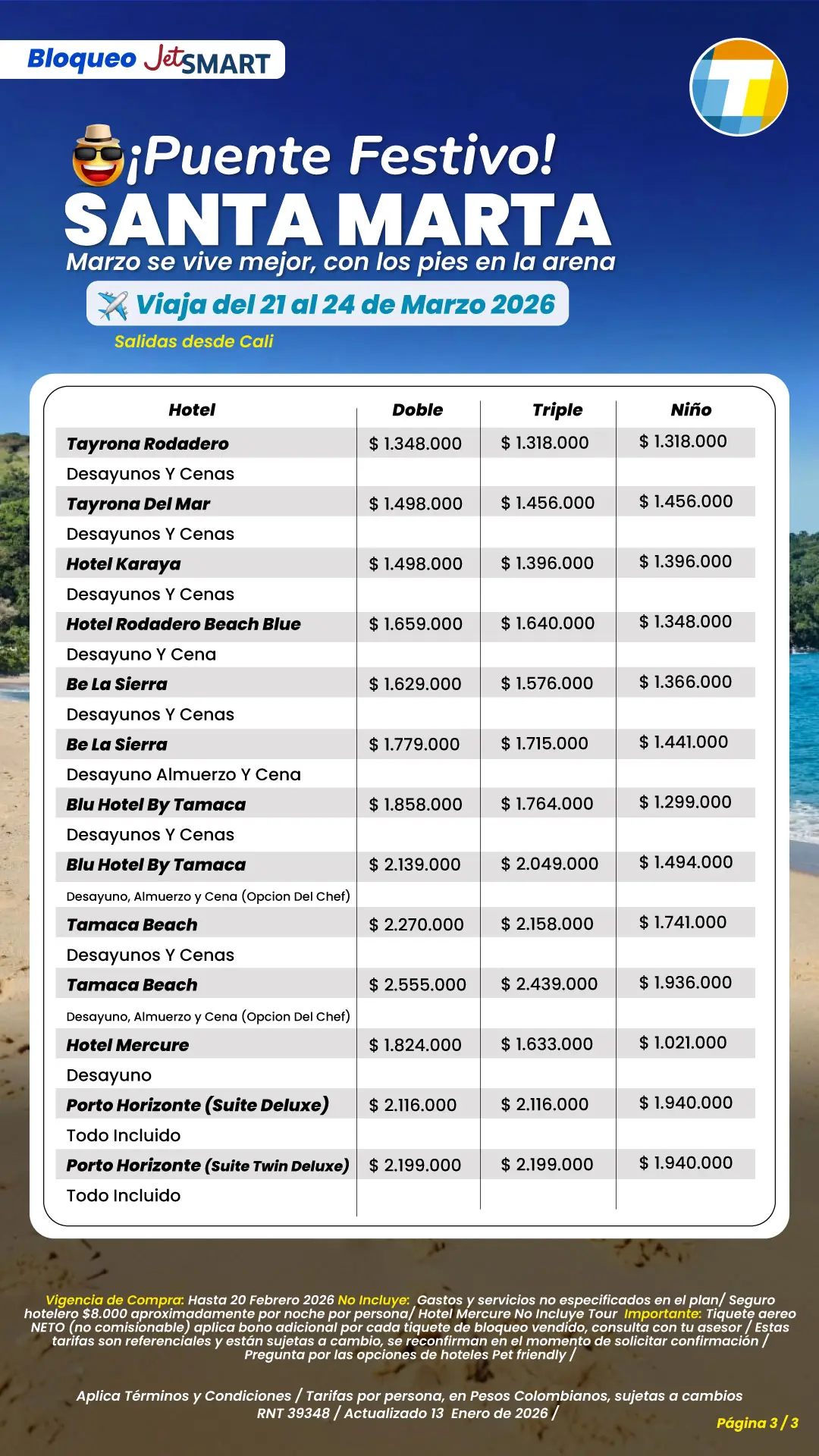 Tarifas por persona en pesos colombianos, sujetas a cambios sin previo aviso, sujetas a disponibilidad de cupos.