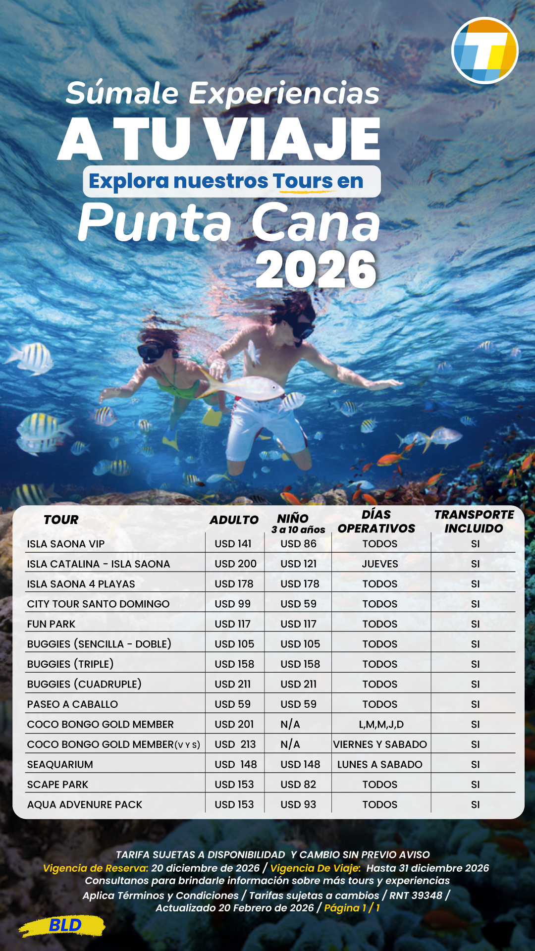 Tarifas por persona en Dólares Americanos, sujetas a cambios sin previo aviso, sujetas a disponibilidad de cupos.