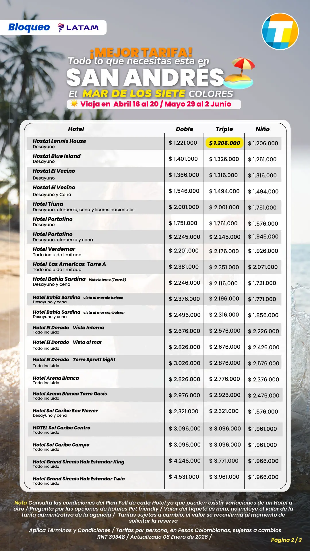 Tarifas por persona en pesos colombianos, sujetas a cambios sin previo aviso, sujetas a disponibilidad de cupos.