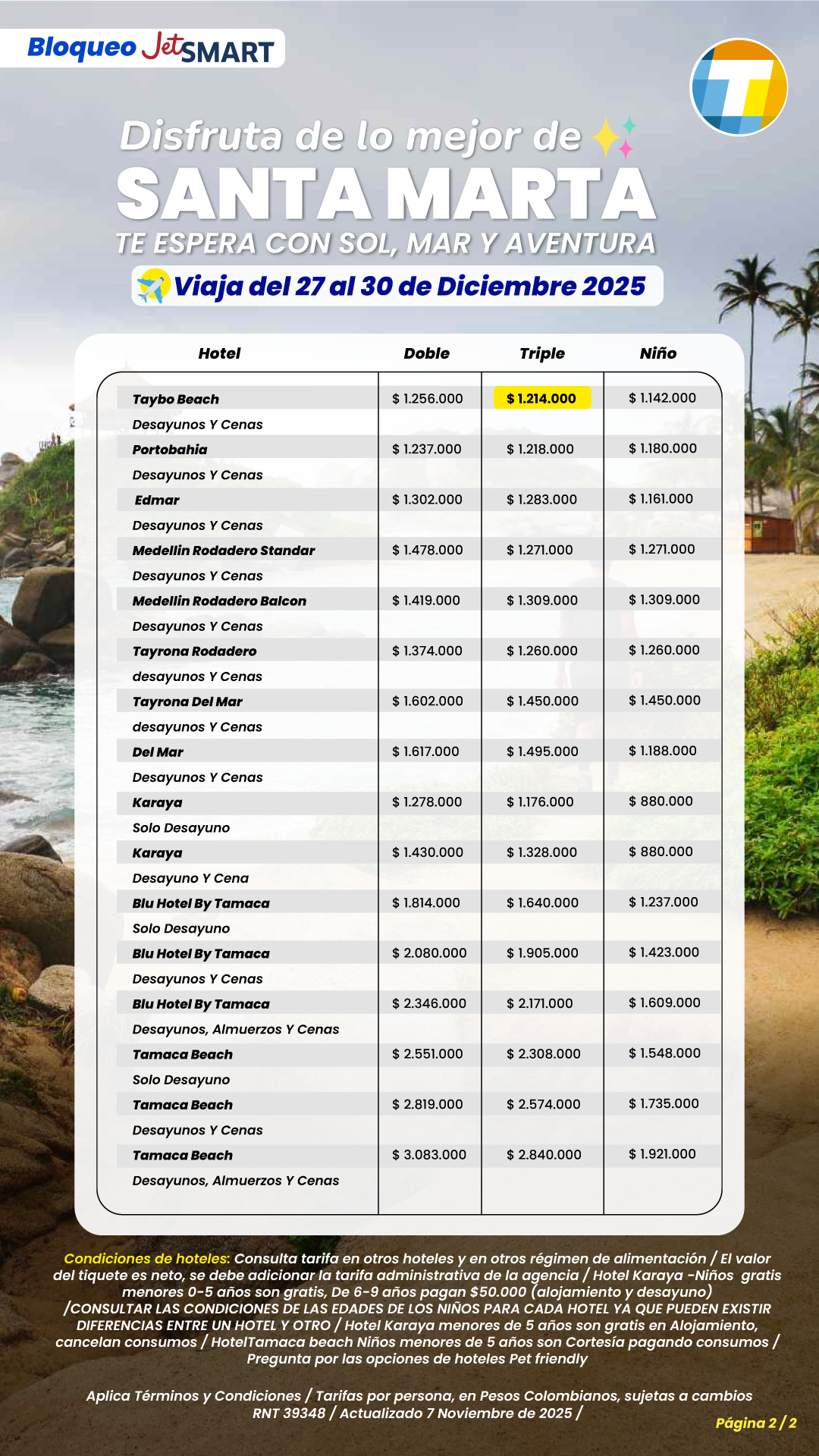 Tarifas por persona en pesos colombianos, sujetas a cambios sin previo aviso, sujetas a disponibilidad de cupos.