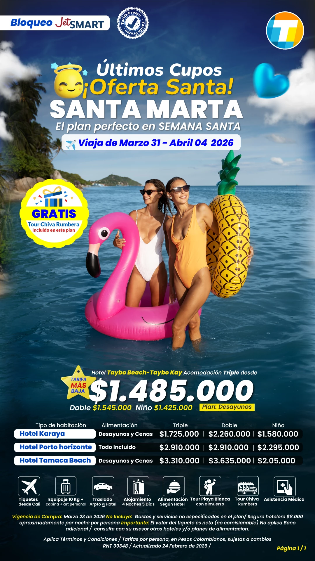 Tarifas por persona en pesos colombianos, sujetas a cambios sin previo aviso, sujetas a disponibilidad de cupos.