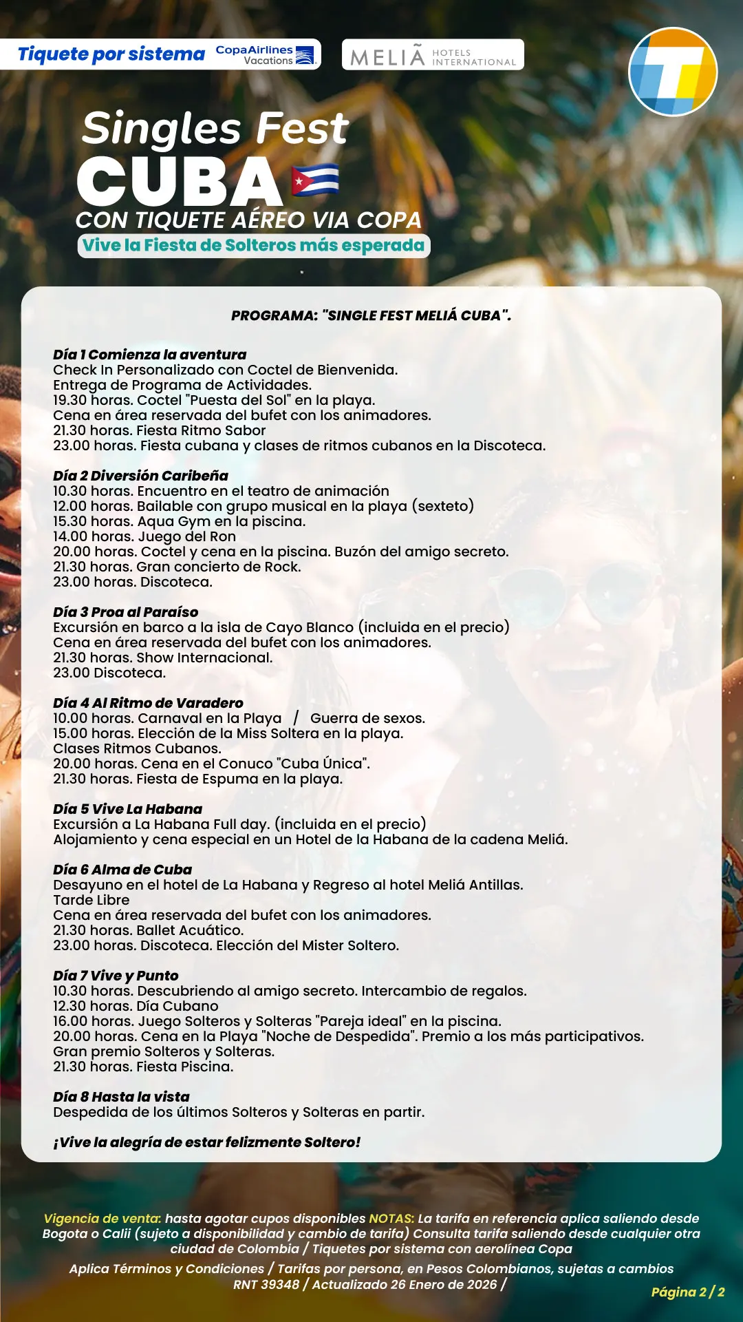 Tarifas por persona en Pesos Colombianos, sujetas a cambios sin previo aviso, y a disponibilidad de cupos.