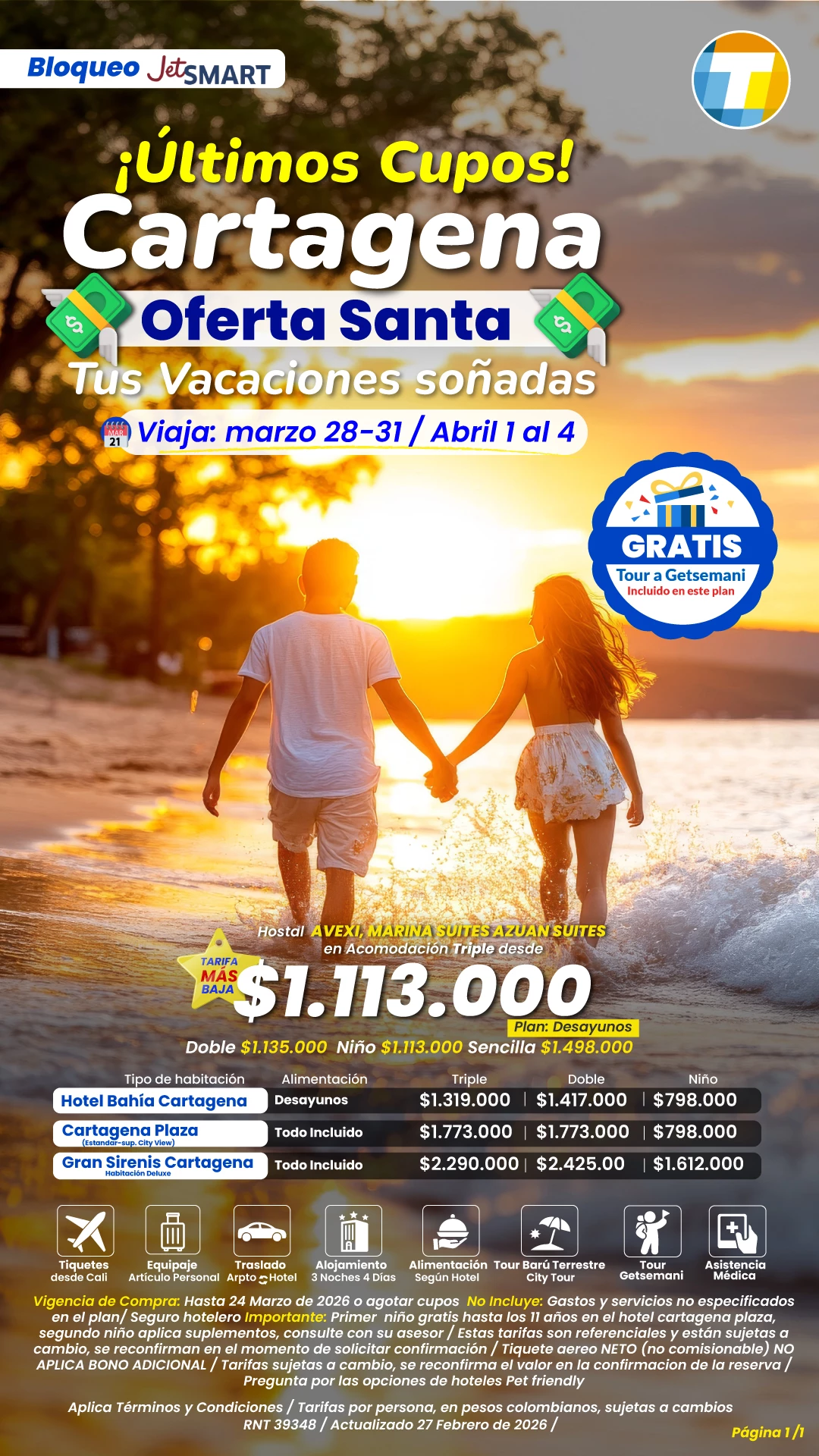 Tarifas por persona en pesos colombianos, sujetas a cambios sin previo aviso, sujetas a disponibilidad de cupos.